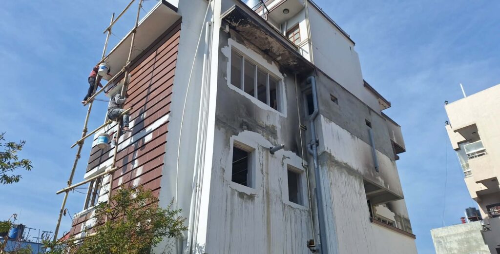 जेन्जी आन्दोलनका क्रममा आगजनी भएको भक्तपुरको लोकन्थलीस्थित पूर्व सञ्चारमन्त्री गोकुल प्रसाद बास्कोटाको घरमा रंगरोगन गरिँदै। तस्बिर: डुनामिस न्युज।